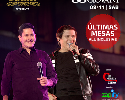 Gian & Giovani se apresentam em Contagem neste sábado Redacao 4 de novembro de 2019 Cultura, Notícias Apresentação acontece no Carretão Trevo e as últimas mesas podem ser adquiridas pelo site www.zapify.com.br A dupla Gian & Giovani desembarca em Contagem neste sábado, 09 de novembro, 21h, no Carretão Trevo (Av. Colúmbia, 960 – Novo Riacho, Contagem – MG), para um grande show. As últimas mesas podem ser adquiridas pelo site www.zapify.com.br . A história de sucesso de Gian & Giovani começou em Franca, interior de São Paulo, quando os irmãos Aparecido e Marcelo, ainda crianças, tocavam violão escondido do pai, o Sr. Francisco. No entanto, logo depois, o Sr. Francisco resolveu incentivar os três filhos, Aparecido, Marcelo e Arnaldo, a formar o trio Sereno, Sereninho e Gauchinho. Em pouco tempo eles já faziam apresentações ao vivo e com a ajuda de um padrinho, decidiram transformar o trio em dupla. Com esforço e dedicação, foram para a gravadora Continental que lançou o primeiro LP no ano de 1988. De lá para cá são mais de 10 álbuns lançados e sucessos que estão gravados na memória dos fãs. Entre os sucessos que não poderão faltar na apresentação, Gian & Giovani, os clássicos “Convite de Casamento”, “Eu Busco Uma Estrela”, “Te Amo”, “Caí no Laço” e muitas outras músicas que fazem parte da carreira dos sertanejos. O show de Gian e Giovani em Contagem é uma realização do Carretão Trevo com a produção da Horta Produções e Eventos. Os ingressos de mesas estão à venda no local e no site www.zapify.com.br. Conforto O Carretão Trevo se destaca por sediar shows inesquecíveis de renomados artistas da música nacional. Guilherme Arantes, Paulo Ricardo, Rick & Renner, Cézar & Paulinho, Sérgio Reis, Ira! e muitos outros ícones já subiram ao palco da casa. O espaço oferece para o público total conforto, já que é possível assistir aos shows confortavelmente sentado. Além disso, os shows contam com atendimento especial all inclusive de bebidas e comidas. Tudo isso com muita segurança e estacionamento no local. Serviço Gian & Giovani se apresentam em Contagem no mês que vem Local: Carretão Trevo (Av. Colúmbia, 960 – Novo Riacho, Contagem) Data: 09 de novembro (sábado) Horário: A partir das 21h Mesas: Diamante 4 lugares: R$ 1.200,00 Ouro 4 lugares: R$ 1.000,00 Ouro 6 lugares: R$ 1.500,00 Prata 4 lugares: ESGOTADO! Prata 6 lugares ESGOTADO! Bronze 4 lugares: ESGOTADO! Vendas no local e no site http://www.zapify.com.br/ atualizado em 04/11/2019 - 11:57 comentários