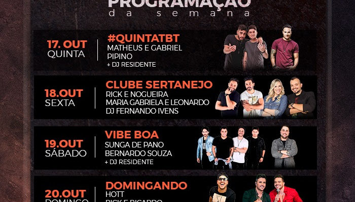 Rust Music Bar apresenta sertanejo, samba e pagode durante a semana Redacao 17 de outubro de 2019 Cultura, Notícias De quinta a domingo, casa receberá shows de Matheus & Gabriel, Pipino, Rick & Nogueira, Maria Gabriela e Leonardo, DJ Fernando Ivens, Sunga de Pano, Bernardo Souza, Hott, Rick & Ricardo e DJ Siman Após o estouro da inauguração em Belo Horizonte, a Rust Music Bar (Av. Professor Mário Werneck, 50 – Estoril, Belo Horizonte – MG), um dos novos espaços de entretenimento e diversão da capital mundial dos bares, começa a divulgar sua programação semanal para o público. De quinta a domingo (17 a 20 de outubro), a casa receberá animados shows. No dia 17 de outubro, quinta-feira, na #QUINTATBT, será a vez da dupla sertaneja Matheus & Gabriel animar o público com seus grandes sucessos. Mas além deles, o cantor Pipino e o DJ da casa prometem não deixar ninguém parado. Já no dia 18 de outubro, sexta-feira, a Rust Music Bar receberá, no CLUBE SERTANEJO, a dupla Rick & Nogueira, Maria Gabriela e Leonardo e o DJ Fernando Ivens. Já no dia 19 de outubro, sábado, o bar traz, na VIBE BOA, o grupo Sunga de Pano, o cantor Bernardo Souza e DJ. Para fechar a semana com chave de ouro, no dia 20 de outubro, domingo, o DOMINGANDO chega com o cantor Hott, Rick & Ricardo e DJ Siman. Com ótima localização, a Rust Music Bar está totalmente preparada para receber o público. Com capacidade para 1200 pessoas, o local oferece muito entretenimento com as melhores bandas da cidade e grandes artistas nacionais em um palco de 60m². Tudo isso em meio a seis camarotes com sofás e claro, total conforto. Para trazer ainda mais comodidade ao público, o local, que é um bar até certo horário, e depois, à noite, uma animada balada, oferece também, estacionamento terceirizado coberto ao lado do estabelecimento, para 150 carros. Além da diversão e da descontração, a Rust Music Bar oferece um cardápio especial e bem ‘antenado’ com o que o público geralmente gosta de consumir nas noitadas. No local é possível pedir, de comida japonesa, passando por porções simples e muito bem feitas, até espetos e os mini-hambúrgueres. Programação da semana – Dia 17 de outubro, quinta-feira: Matheus & Gabriel | Pipino e DJ Residente. – Dia 18 de outubro, sexta-feira: Rick & Nogueira | Maria Gabriela & Leonardo e o DJ Fernando Ivens. – Dia 19 de outubro, sábado: Sunga de Pano | Bernardo Souza e DJ Residente. – Dia 20 de outubro, domingo: Hott, Rick & Ricardo e DJ Siman. Rust Music Bar Local: Av. Professor Mário Werneck, 50 – Estoril, Belo Horizonte – MG Horário: A partir das 19h Couvert artístico: off até 20h30 e R$ 20 após este horário Classificação etária: 18 anos Redes Sociais: Instagram: @rustmusicbar Facebook: Rust Music Bar comentários
